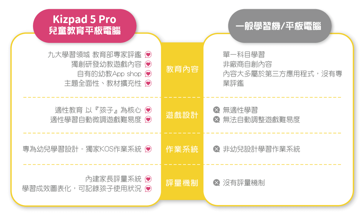 不想讓孩子接觸到色情暴力網站?Kizpad 兒童模式阻絕所有不適合孩子的內容;Kizpad 家長模式讓您掌握孩子的學習歷程,搶先一步發掘孩子的興趣與專長;並搭配獨家時間控制系統,家長可自由調配遊玩和休息規則;讓孩子不沉迷、也保護好視力!