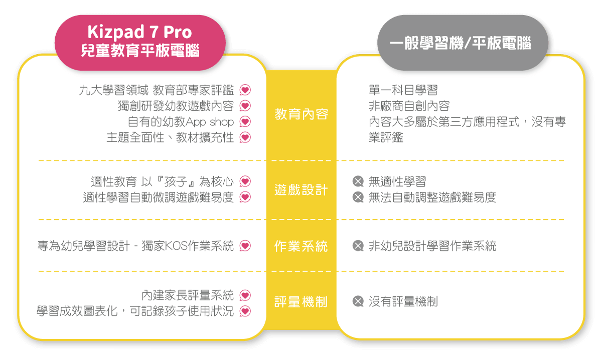 不想讓孩子接觸到色情暴力網站?Kizpad 兒童模式阻絕所有不適合孩子的內容;Kizpad 家長模式讓您掌握孩子的學習歷程,搶先一步發掘孩子的興趣與專長;並搭配獨家時間控制系統,家長可自由調配遊玩和休息規則;讓孩子不沉迷、也保護好視力!