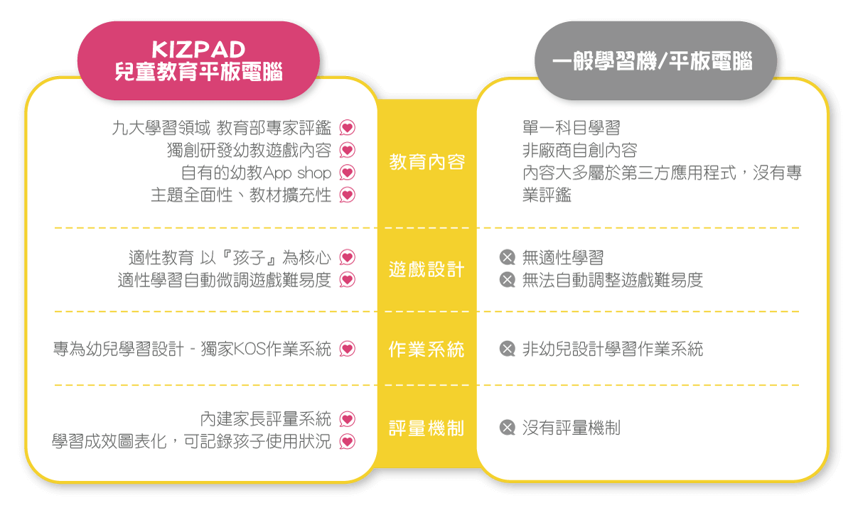 不想讓孩子接觸到色情暴力網站?Kizpad 兒童模式阻絕所有不適合孩子的內容;Kizpad 家長模式讓您掌握孩子的學習歷程,搶先一步發掘孩子的興趣與專長;並搭配獨家時間控制系統,家長可自由調配遊玩和休息規則;讓孩子不沉迷、也保護好視力!